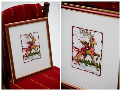 Blitzen (Mirabilia), White Belfast Linen, DMC, Kreinik, Caron Waterlilies, Mill Hill Beads